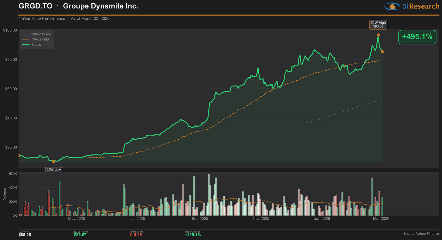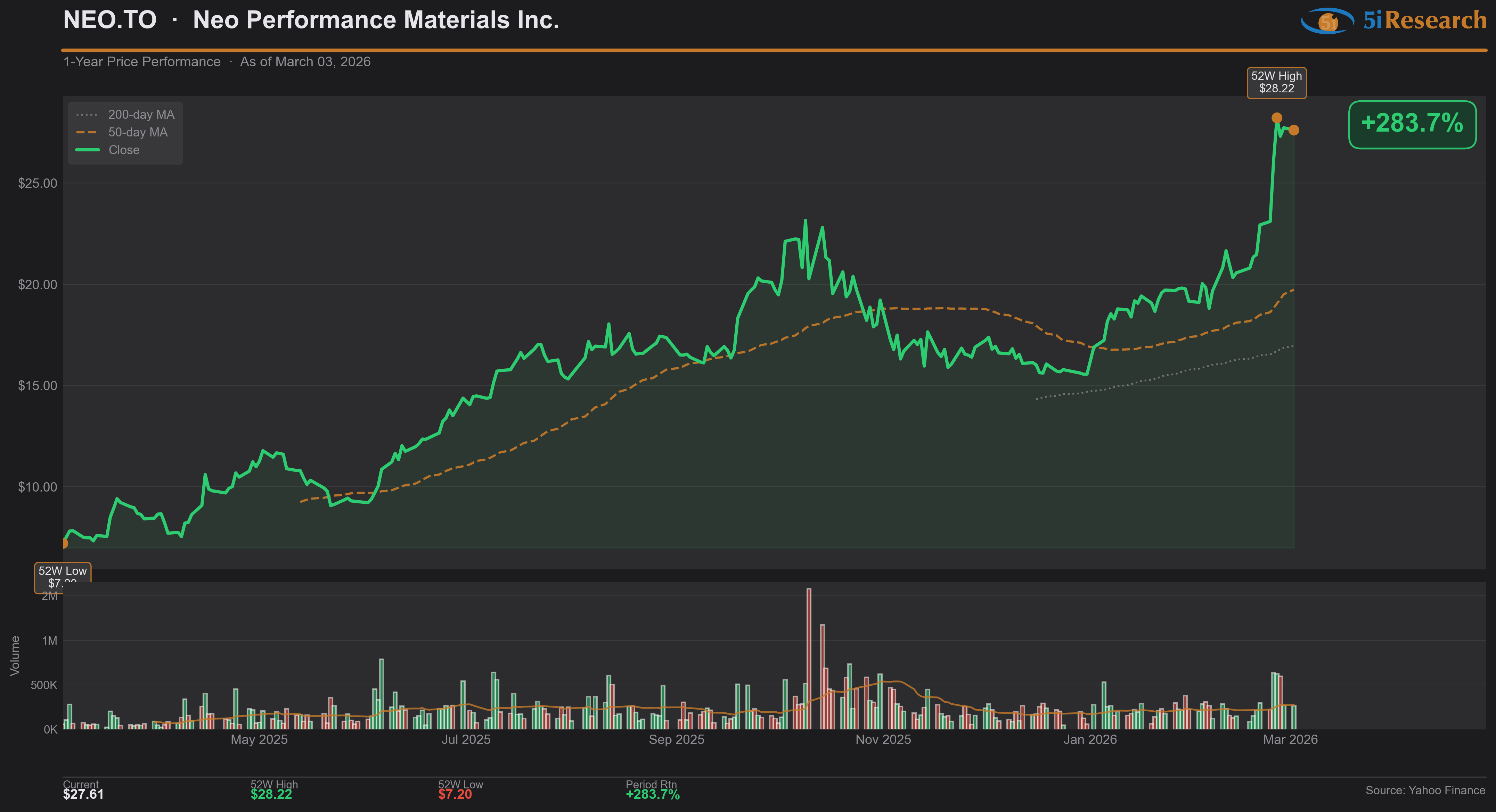 Neo manufactures rare earth materials and rare metal-based functional materials used in magnets, catalysts, and advanced industrial applications. The stock joins our list on the opening of its first European magnet production facility and the securing of multi-year supply agreements with automotive tier-one customers, positioning the company as a Western alternative to China-dominated supply chains. NEO is benefiting from a broader investor pivot toward critical materials plays as governments prioritize supply chain resilience and electric vehicle manufacturers seek geographically diversified sourcing, driving the stock to multi-year highs against a relatively flat TSX Materials index.