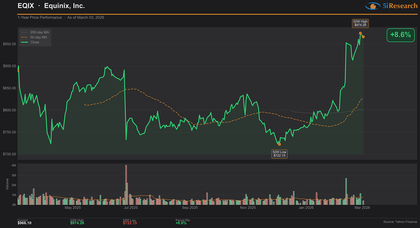 Equinix operates a global platform of data center assets and interconnection services spanning financial hubs and enterprise markets worldwide. The name appears on our screen following record bookings activity driven by artificial intelligence workload deployment and a transformational Nordic acquisition that expands its capacity in power-rich geographies. Real estate investors are increasingly differentiating between commodity data center operators and interconnection-focused platforms with embedded network effects, with EQIX capturing a premium multiple as hyperscalers and AI developers prioritize proximity and low-latency connectivity over raw compute capacity alone.