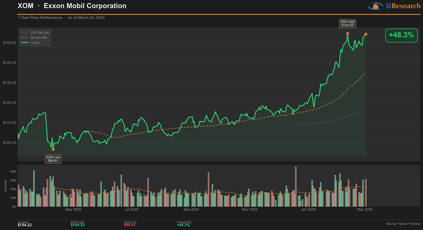 Exxon Mobil is an integrated energy supermajor with upstream, downstream, and chemical operations spanning global markets. XOM breaks onto our list following record production volumes concentrated in the Permian Basin and an assertion of multi-decade growth runway in North American unconventional oil, combined with one of the sector’s most aggressive shareholder return programs. Energy has emerged as the standout S&P sector performer in the current quarter as investors rotate toward cash-generative, capital-disciplined operators amid geopolitical supply uncertainties, with Exxon’s operational scale and balance sheet flexibility positioning it as the defensive anchor in a volatile commodity environment.